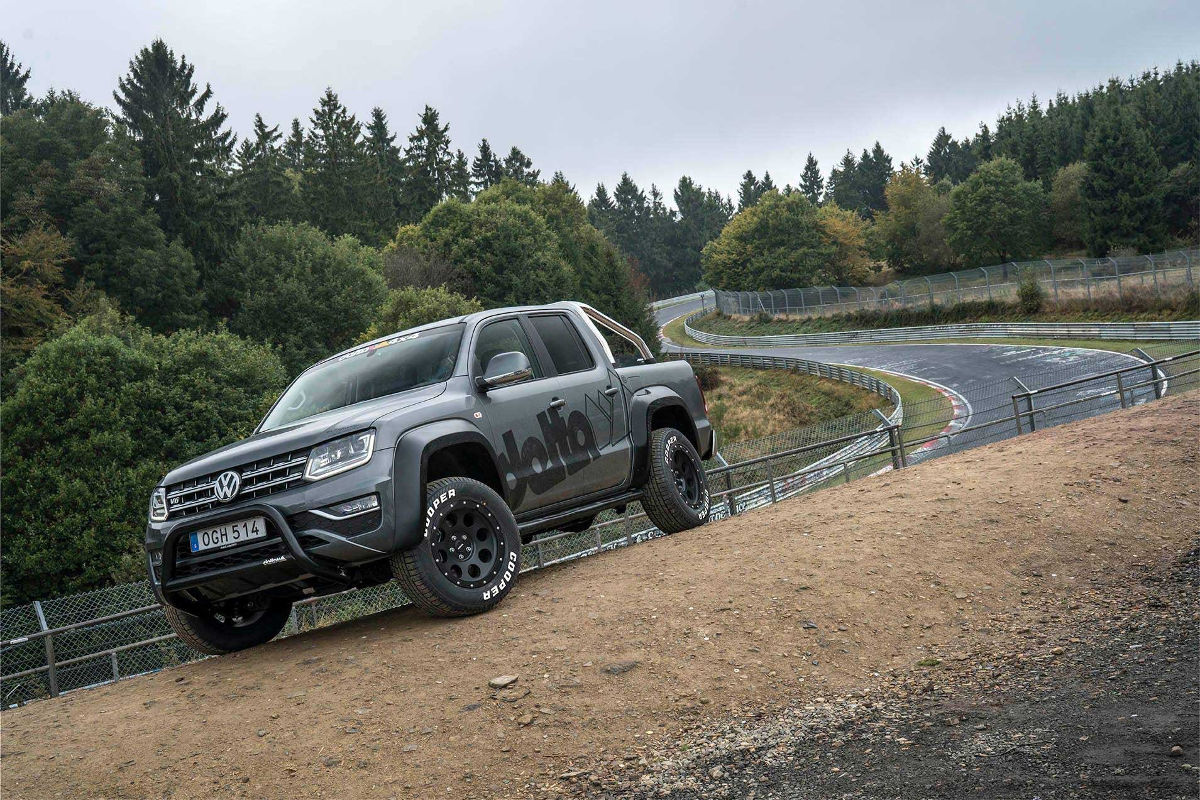 Nach dem ausgiebigen Amarok Tuning vom bayrischen Offroad-Experte ließ James Holm gleich mal im Nürburgring (grüne Hölle) den Asphalt brennen. Mit einer Rundenzeit von unter zehn Minuten dürfte er wohl hierbei die Tagesbestzeit für einen Pickup hingelegt haben.