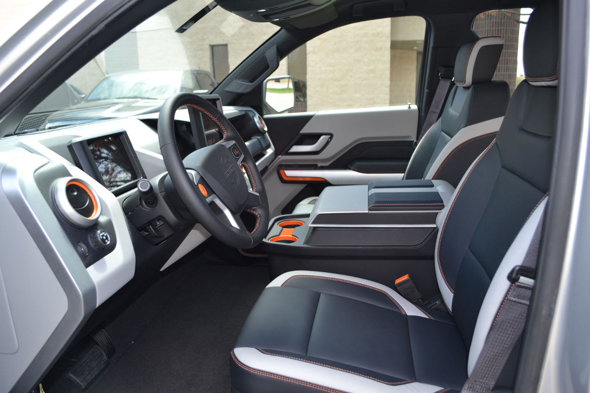 Im Innenraum wird der Fahrer mit einem volldigitalen Cockpit (mit Touchscreens als Bedienoberfläche) verwöhnt. Aber auch in Sachen Sicherheit braucht sich der E-Pickup nicht zu verstecken. Hier wartet er mit Notbrems- und Spurhalteassistent, einer Spurverlassenswarnung, Airbags, einem Kollisionswarner sowie mit adaptivem Tempomat auf.