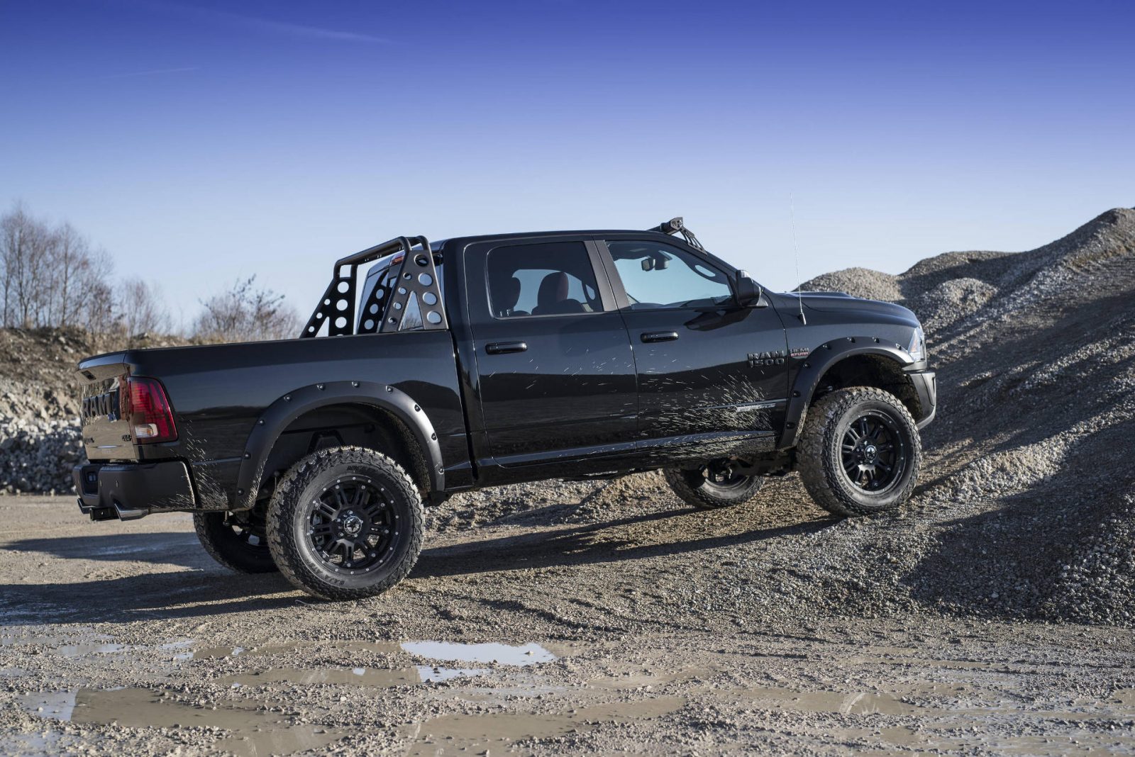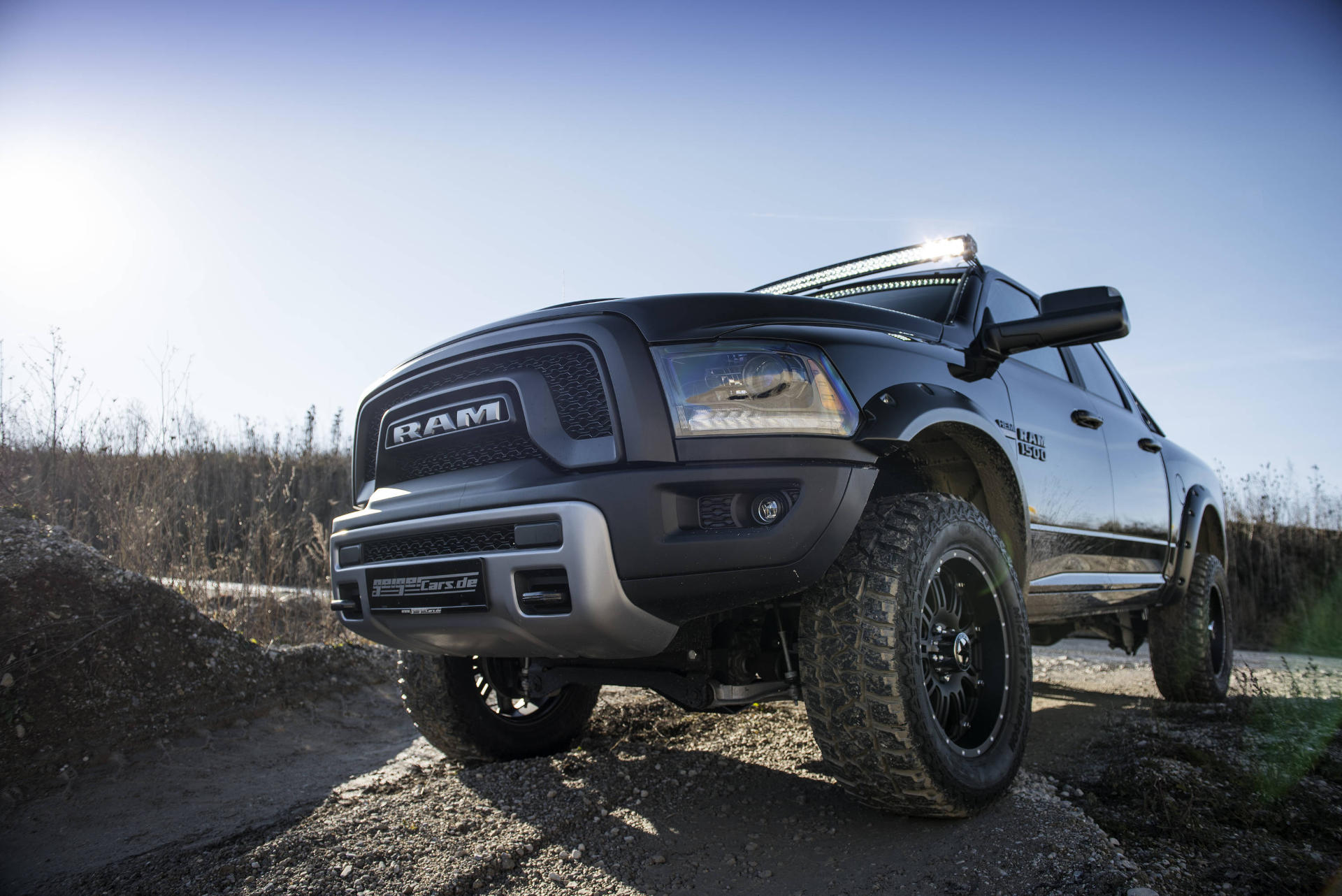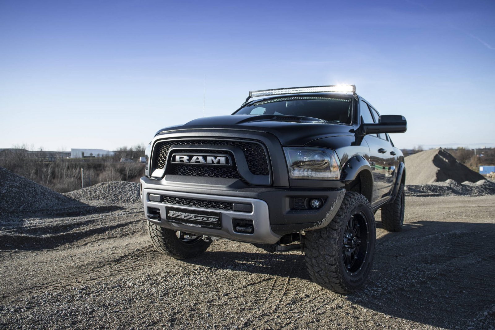 Auch optische verpasste man dem Dodge Ram 1500 Rebel ein rustikaleres Erscheinungsbild. Neben den Kotflügelverbreiterungen sorgen Distanzscheiben für eine um 36 mm vergrößerte Spurweite. Außerdem stattete man den Pickup Truck mit einem massiven Ladeflächen-Überrollbügel sowie einem breiten LED-Dachscheinwerfer-Band aus, welches auf Knopfdruck die Nacht zum Tag macht.