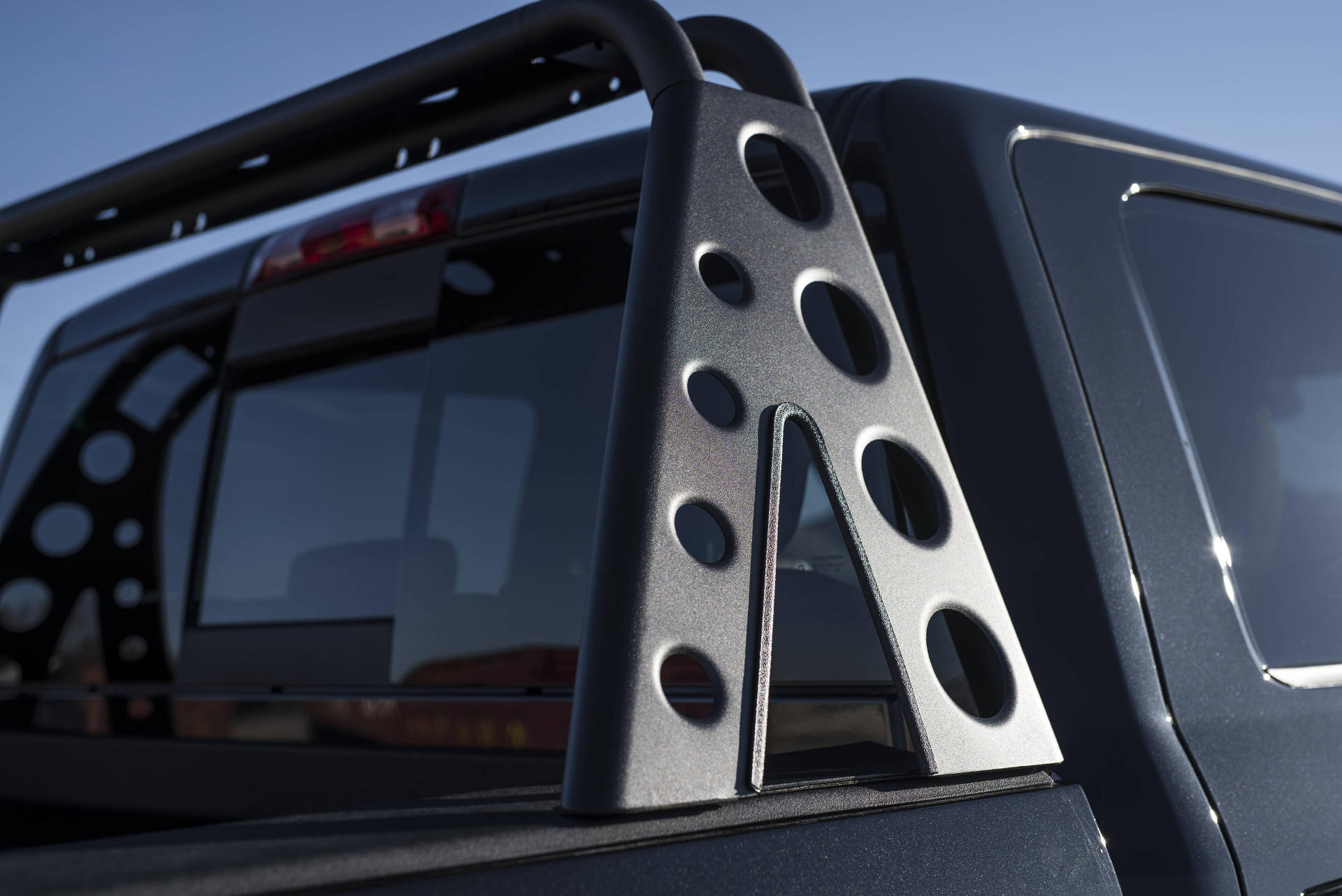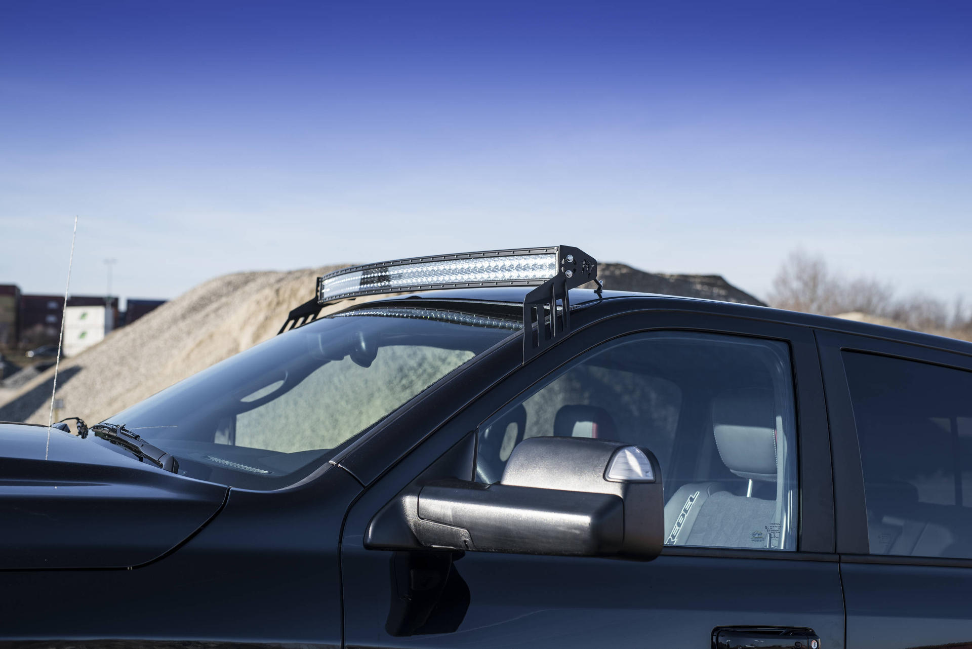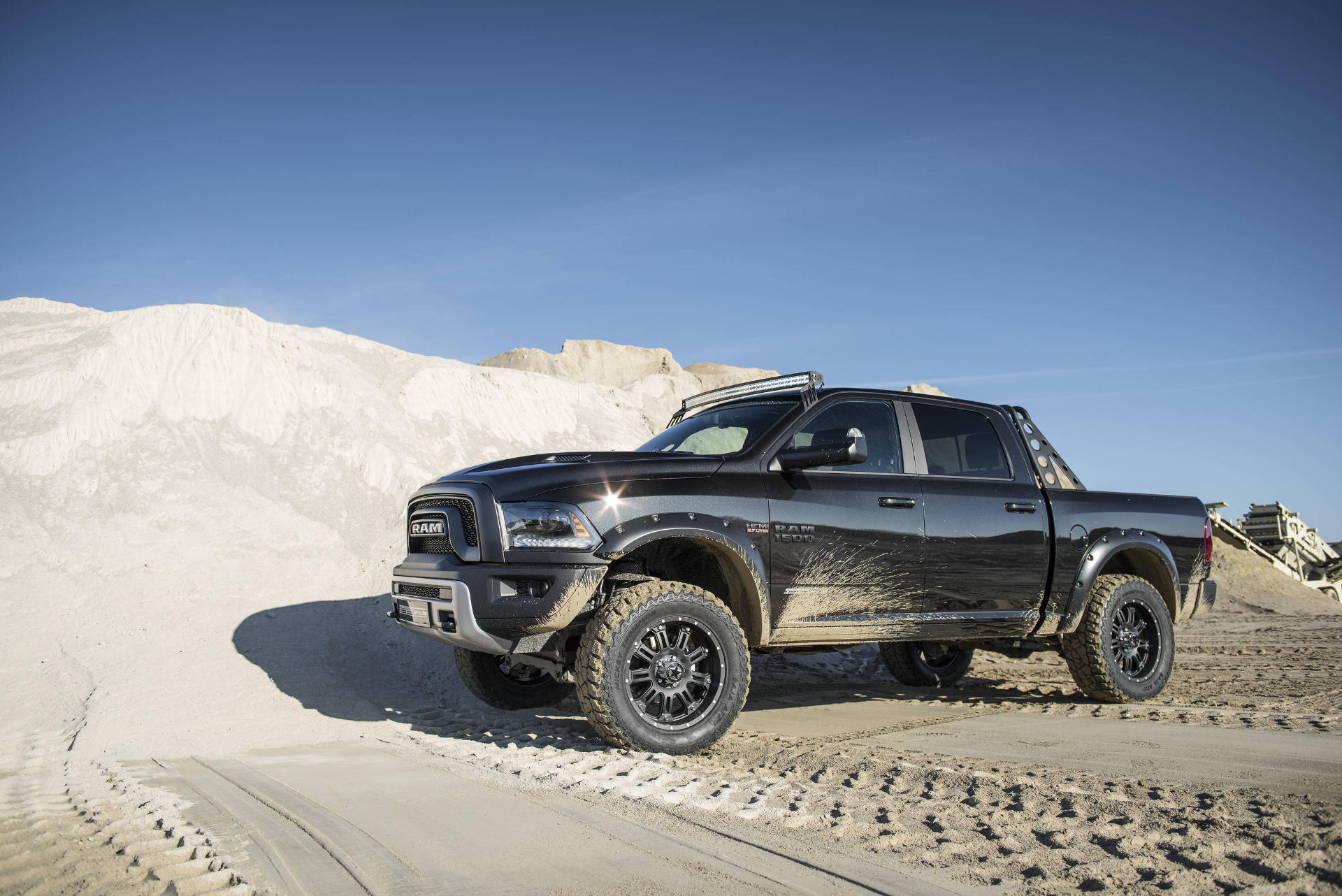 Auch optische verpasste man dem Dodge Ram 1500 Rebel ein rustikaleres Erscheinungsbild. Neben den Kotflügelverbreiterungen sorgen Distanzscheiben für eine um 36 mm vergrößerte Spurweite. Außerdem stattete man den Pickup Truck mit einem massiven Ladeflächen-Überrollbügel sowie einem breiten LED-Dachscheinwerfer-Band aus, welches auf Knopfdruck die Nacht zum Tag macht.