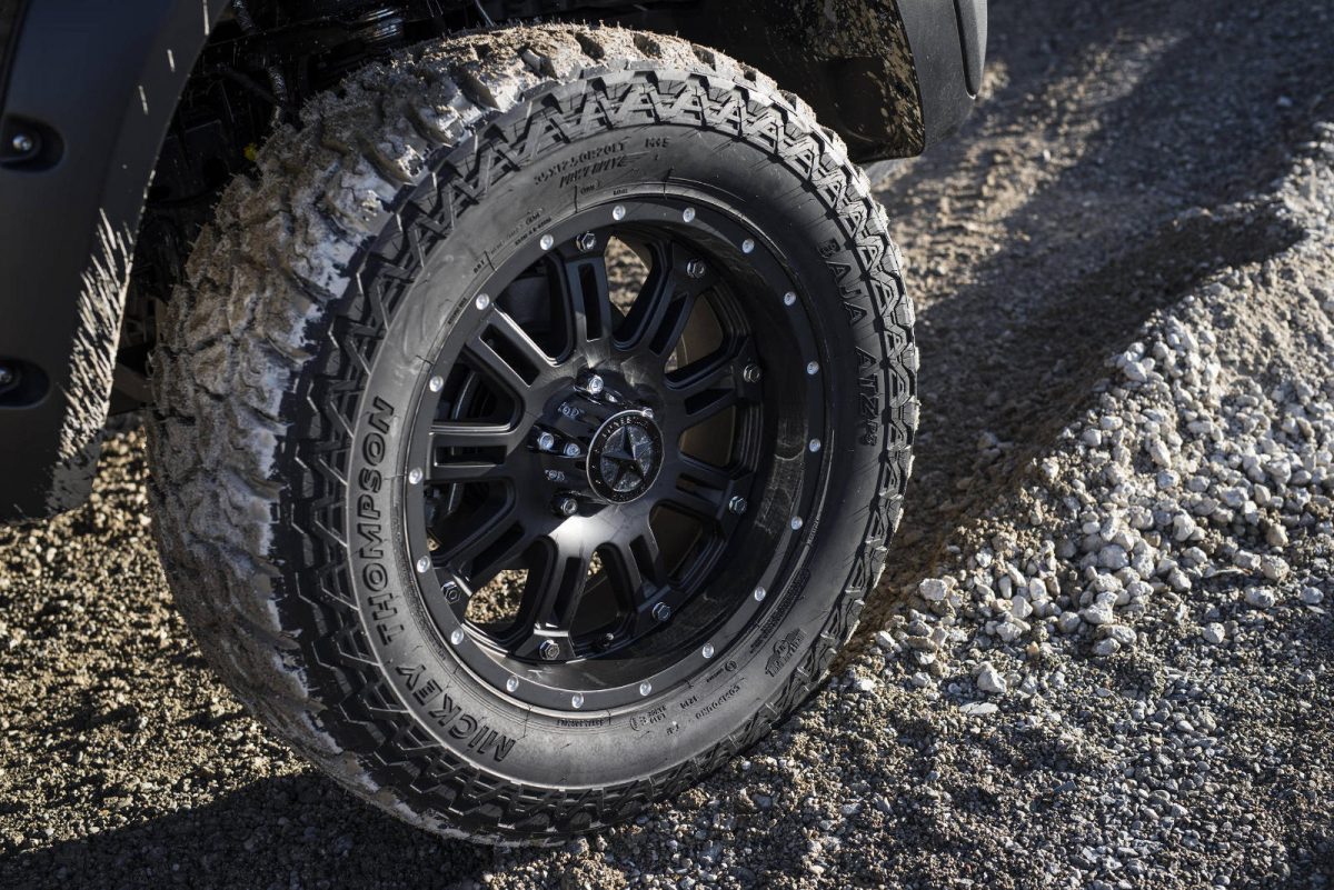 Um den 5,82 Meter langen Pickup Truck noch leichtfüßiger im harten Gelände zu machen, schraubte das Team von GeigerCars den Rebel um einige Etagen nach oben. Durch die Fahrwerkshöherlegung (10 cm) und mit nun grobstolligen 20-Zoll Rädern (von Mickey Thompson im Format 35 x 12,5 R20) stellen steile Rampen, tieferes Gewässer und Schlamm kein Hindernis mehr dar.